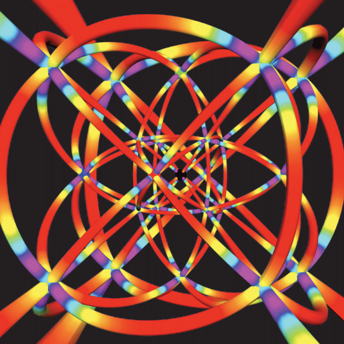 In Light Echoes, light, sound, and mathematics intertwine in a shifting play of form and motion. At the heart of the installation, the hidden geometry of higher dimensions is transformed into a living sculpture of color and rhythm. Created by MoMath outreach mathematician Chaim Goodman-Strauss and artist Eugene Sargent, this work draws on the deep symmetries of the four-dimensional sphere to create patterns of light that shimmer, pulse, and respond to the human voice.