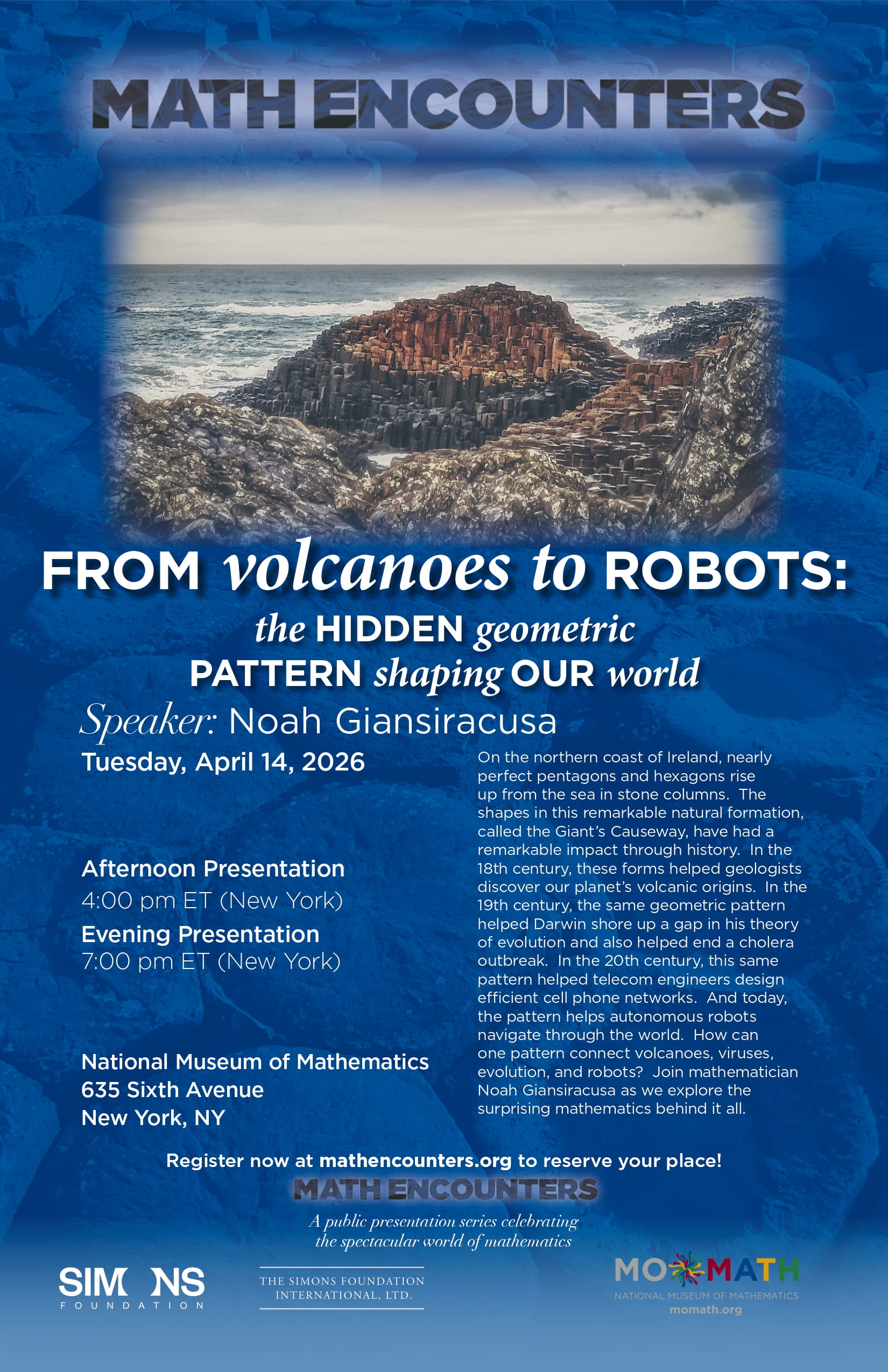 Math Encounters is MoMath’s popular free public presentation series celebrating the spectacular world of mathematics. This program is funded by Simons Foundation International and administered by the Simons Foundation’s Science, Society & Culture division.