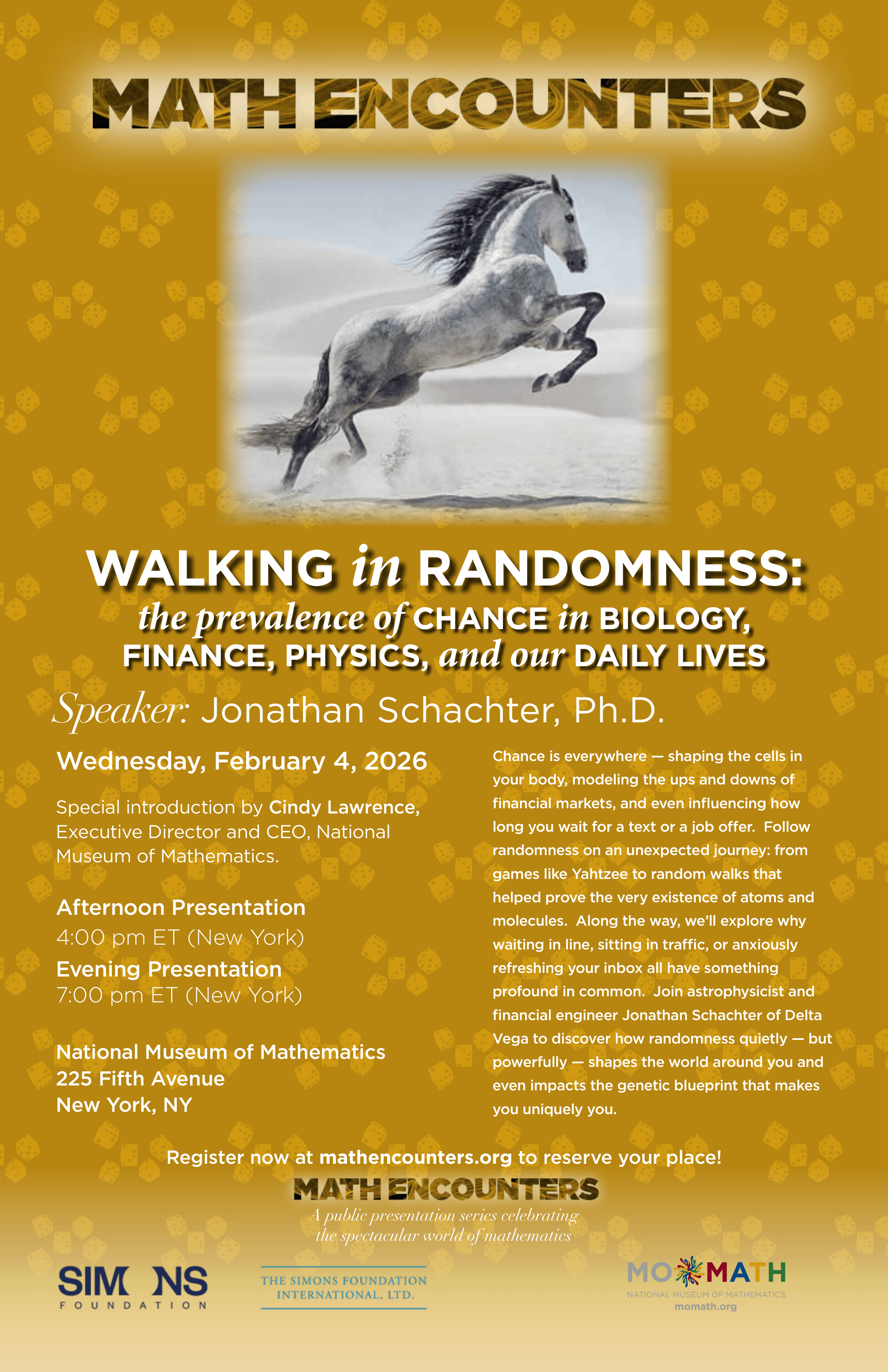 Math Encounters is MoMath’s popular free public presentation series celebrating the spectacular world of mathematics. This program is funded by Simons Foundation International and administered by the Simons Foundation’s Science, Society & Culture division.