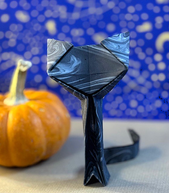 Fold this whimsical Skinny Cat. It looks great in black paper, but any color will do. Add eyes for a playful, cartoon-like touch.