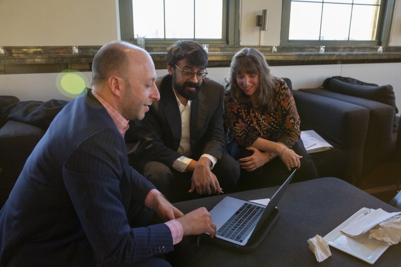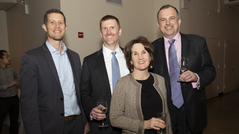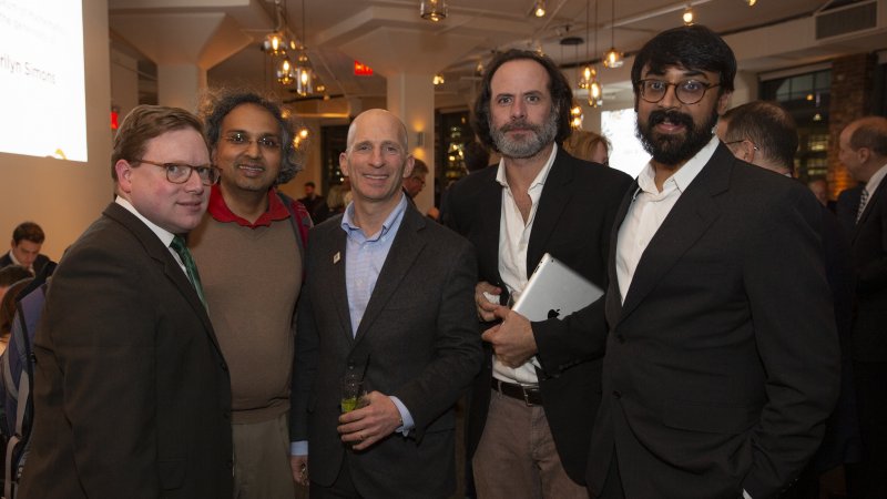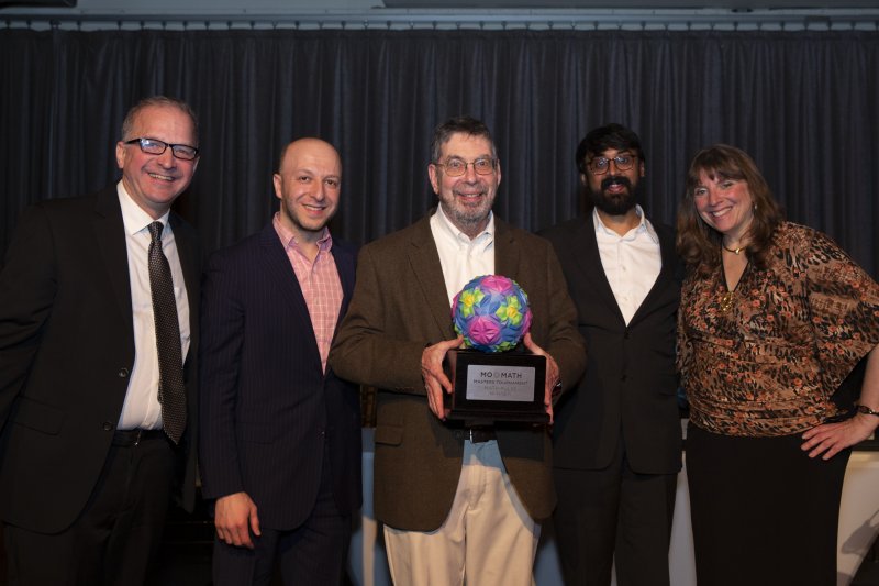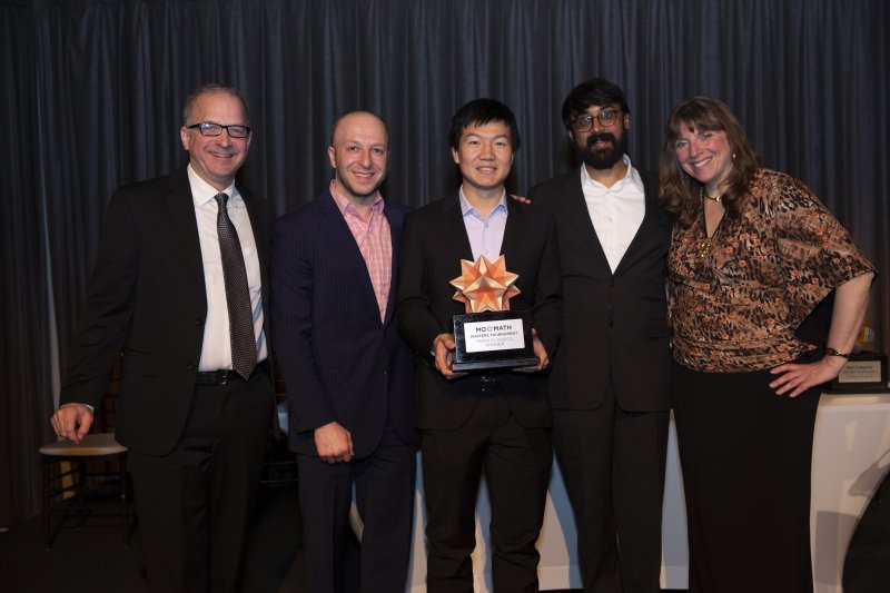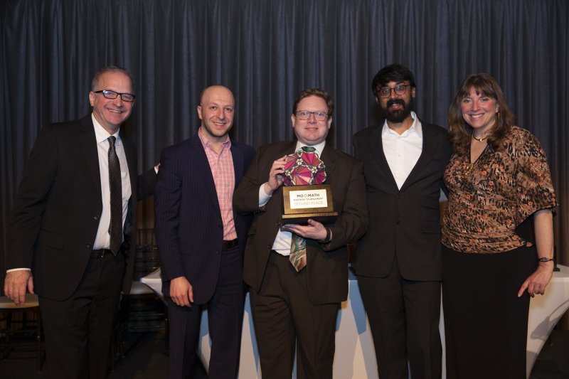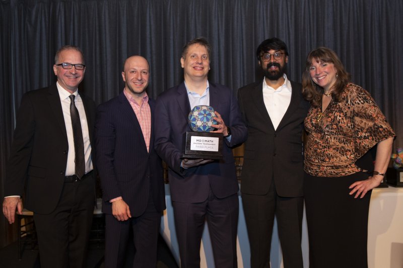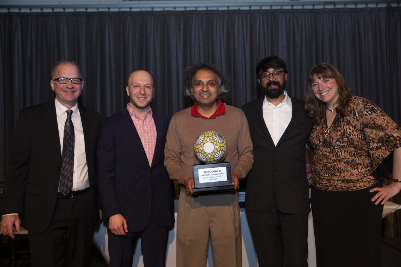 <p style=Associate Director Tim Nissen, Dean of Academic Content Alex Kontorovich, Fields Medalist and Distinguished Visiting Professor Manjul Bhargava, and Executive Director Cindy Lawrence with 2019 MoMath Masters Tournament Champion Geva Patz