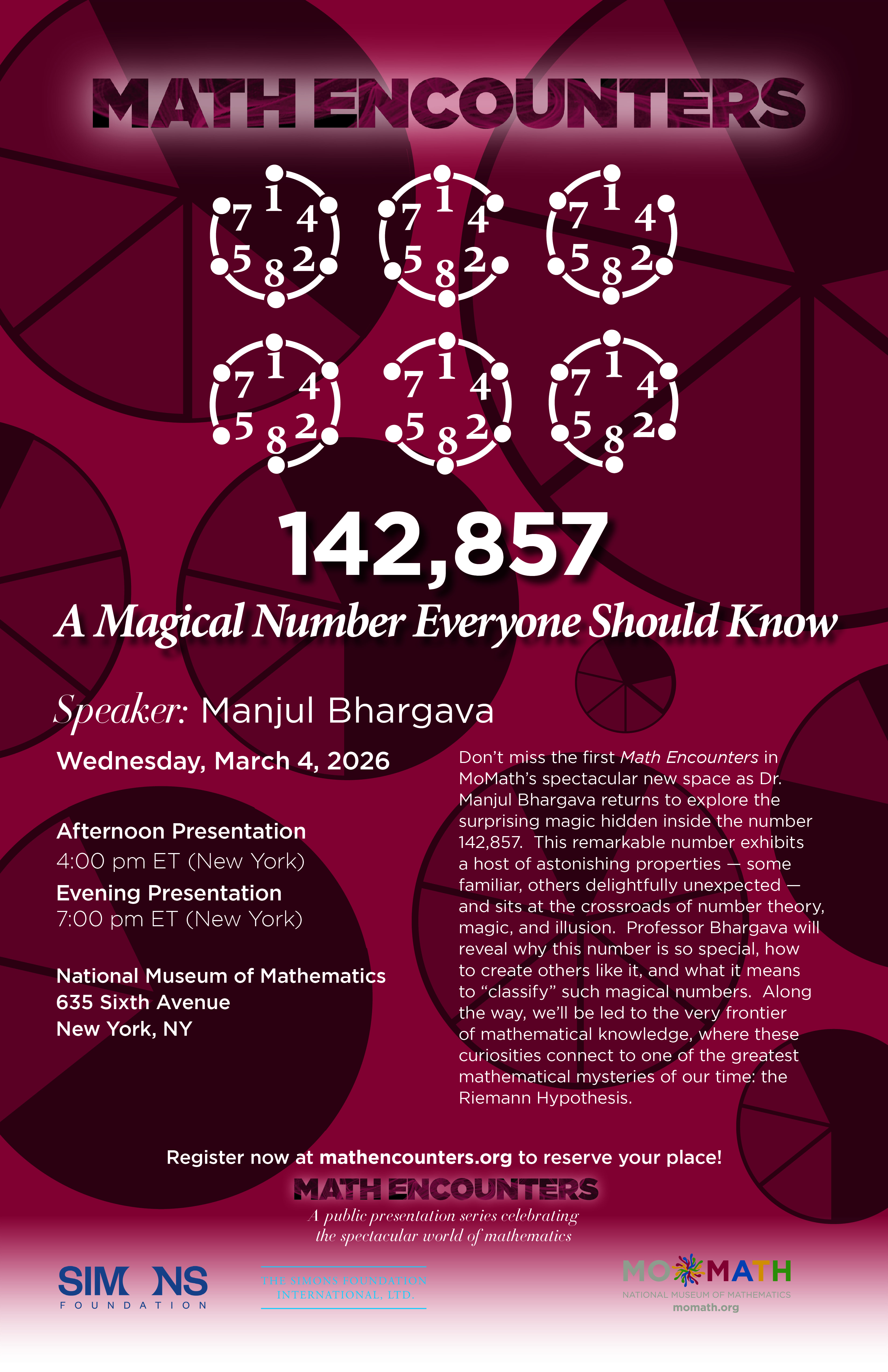Don’t miss the first Math Encounters in MoMath’s spectacular new space as Dr. Manjul Bhargava returns to explore the surprising magic hidden inside the number 142,857. This remarkable number exhibits a host of astonishing properties — some familiar, others delightfully unexpected — and sits at the crossroads of number theory, magic, and illusion. Professor Bhargava will reveal why this number is so special, how to create others like it, and what it means to “classify” such magical numbers. Along the way, we’ll be led to the very frontier of mathematical knowledge, where these curiosities connect to one of the greatest mathematical mysteries of our time: the Riemann Hypothesis.