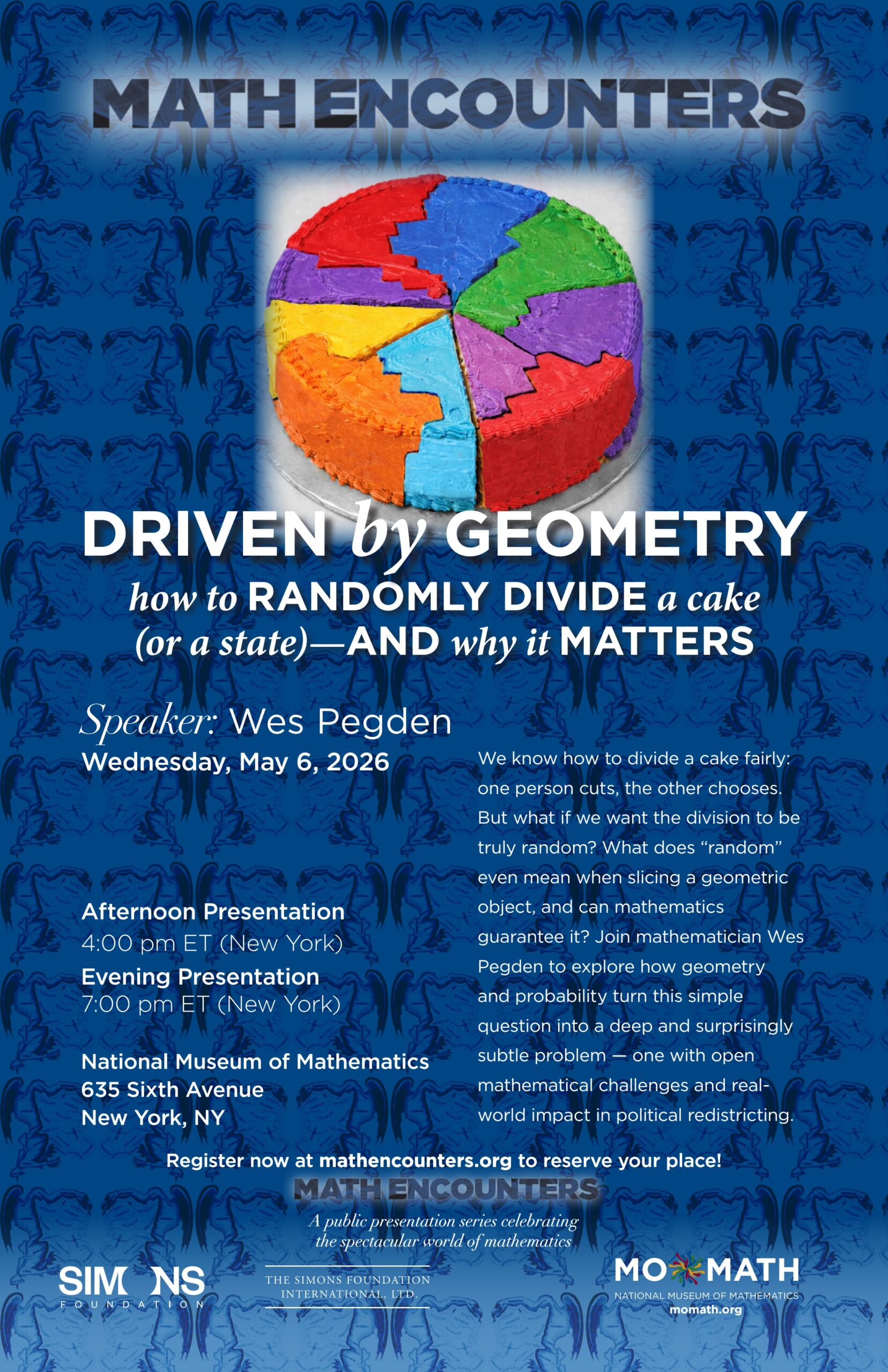 Math Encounters is MoMath’s popular free public presentation series celebrating the spectacular world of mathematics. This program is funded by Simons Foundation International and administered by the Simons Foundation’s Science, Society & Culture division.