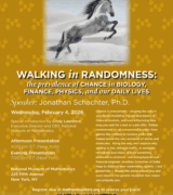 - 2026 February 4 — “Walking in Randomness: The prevalence of chance in biology, finance, physics, and our daily lives” featuring Jonathan Schachter (video coming soon)